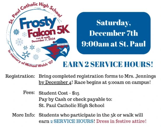 Parent/Student Newsletter - December 2024 | |  | Last Wednesday, during Mass, Father Daniel informed the faculty and students that Archbishop Coyne has allowed for St. Paul Catholic High School to offer a program for students in grades 10-12 who have not yet completed their Sacraments of Initiation. For those who are Catholic, this would include First Eucharist (as needed) and Confirmation. We also welcome those students who wish to become Catholic to join us as well. There will be an informational meeting after school on Wednesday, December 11 in the Campus Ministry Office. Please email Mr. Duffany or Father Daniel for additional information. | Academics & School Counseling | School Counseling BROWN BAG LUNCH SERIES: The School Counseling Department hosts our Brown Bag Lunch career panel series as a great career exploration option for our students. They hear about careers they may be interested in from a panel discussing their job and the path to their career, giving our students an overview of what they do and finish with a Q&A from students. Students, make note of the following dates: December 12th: Architecture, Construction and Engineering January 9th: Health Sciences February 13th: Business, Management, Administration and Finance March 13th: Education April 10th: IT/Computer Science Students - remember to visit the guidance office to attend. | SENIORS: Please share with your School Counselor by emailing or visiting them when you have been accepted to a school you've applied to. ALSO, please share your commitments when you have made them so we can celebrate you! Mrs. Coard Mrs. Priemer DEELEY FOUNDATION SCHOLARSHIP Applications are due by 12/31/24 - The Thomas and Elsie Deeley Foundation Scholarships - The Thomas and Elsie Deeley Foundation is a not-for-profit private foundation that established annual scholarships at Sacred Heart High School in Waterbury, Connecticut and more recently St. Paul Catholic High School in Bristol, Connecticut. The scholarships are available to seniors who wish to attend either a 2-year or 4-year college/university. FOR MORE INFO & TO APPLY CAP, GOWN and DIPLOMA Information needed! Haven't filled out the form for your cap and gown or diploma? Deadline was 12/1 - WE NEED THEM ASAP. Please follow this links to complete the forms. 2) Please CLICK HERE to submit cap, gown and diploma information to Josten's. There is no cost associated with ordering your cap and gown. 3) Please CLICK HERE to submit the student's name as it should appear on their diploma. As a reminder, a diploma is a legal document. | JUNIOR COLLEGE NIGHT - TOMORROW NIGHT 12/3 Junior College Night will be held on Tuesday, December 3 at 6:00pm (it was originally scheduled for December 5). The school counseling office invites all St. Paul Junior parents/guardians and students to hear from several college representatives who will be here to share their perspective and answer questions regarding the college process. RSVP HERE | Performing Arts What a fantastic performance by our Performing Arts cast, crew and directors. Thank you to all who supported and came to see the show The Play That Goes Wrong. Onto the Spring musical which will be announced soon. Audition dates are as listed: Sunday, December 15th 3:30pm - 8:30pm auditions Tuesday, December 17th 5:00pm - 8:30pm call backs | Light Up St. Paul Yes it will be chilly but let's get into the Christmas spirit! THIS FRIDAY, 12/6 is our annual Light Up St. Paul Advent Event. Join us for a special evening and help us Light Up St. Paul! Your pre-purchased luminaries for loved ones will light St. Paul's campus on Friday evening, December 6 at 6:00pm. This year we will begin with an Advent Prayer Service in the auditorium, then proceed to the luminary walk, which will end with a nice evening of Christmas music, fire pits, smores and Santa's Corner in the St. Paul courtyard. You'll also have the opportunity to purchase food and other items from our clubs and teams in the dining hall. PURCHASE YOUR LUMINARIES TODAY - until 12/5! | |  |  Gnome ornaments - sewing club | Frosty Falcon 5K and Reindeer Mile The morning after Light Up St. Paul is our Frosty Falcon 5K in honor of Michael Walsh '07. The race begins at 9:00am on Saturday, December 7. Some fun for our younger runners/walkers. Our Reindeer Mile (4-8th grade students) will begin at 8:30am running a mile around the St. Paul campus. Hot cocoa and treats will keep you warm that morning. Festive attire for both races are encouraged! These community events are open to all family, friends and neighbors of St. Paul. The cost of the 5K is $30 and the Reindeer Mile is $5. Race shirts will be given on a first come, first serve basis. Register for either race by clicking the button below. REGISTER FOR EITHER RACE HERE ST. PAUL STUDENTS - You must register with Mrs. Jennings - NOT ONLINE!  | |  We are so proud of you all! | Congrats to the boys’ soccer team on being recognized by the Western Connecticut Soccer Officials Association with the Art Hamm Sportsmanship Award! The boys join the girls’ soccer and the boys’ swim and dive teams who were recognized by their officiating boards last school year and to the girls’ swim and dive team who will be recognized soon by their officiating board. | | Congrats to senior Caleb Chance on signing his National Letter of Intent to attend and play baseball at the University of Massachusetts - Lowell! |  | |  NEW LOCATION Bristol Event Center 112 Century Dr, Bristol Saturday - March 8, 2025 - 6:00pm Reserve your tickets today! | Our biggest fundraiser of the year brings together the entire St. Paul community – parents, alumni, and friends – for a wonderful evening of fellowship and philanthropy, all in support of our school’s mission: providing a faith-filled, comprehensive education to all of our students. We invite you to join us on Saturday, March 8, 2025 at the new Bristol Event Center to celebrate St. Paul and our students. TICKETS & SPONSORSHIPS You'll fi