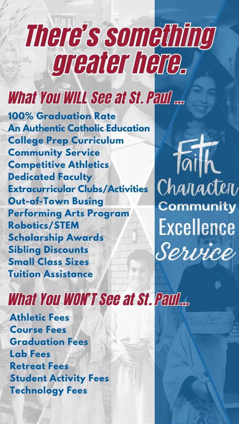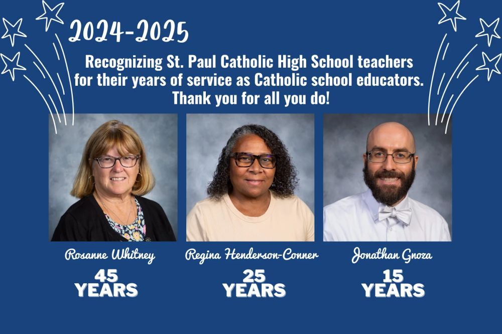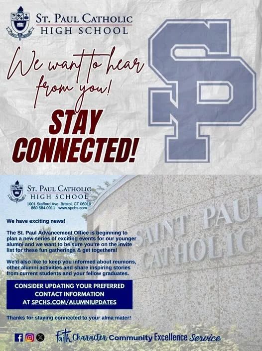 As an alum, past parent, current parent, grandparent, or friend of St. Paul, we thank you for being a part of our vision "to be a truly great Catholic high school". Here you will find St. Paul news you can use - delivered to you once a month during the school year. Enjoy reading about all the great things happening at St. Paul! | Faith Feature Congratulations to our faculty. These three amazing teachers were recognized at the Catholic School Educators Mass and Celebration at the beginning of April.  | Lenten Reconciliation Thank you to Father Daniel for coordinating and to all our visiting Priests who helped with our Lenten Reconciliation. Students from all classes came to reflect and pray during this Lenten season. #faith #Lent2025 #theressomethinggreaterhere | NEASC Accreditation St. Paul Catholic High School was notified that the New England Association of Schools and Colleges Commission has voted to continue St. Paul Catholic High School’s continued accreditation in the Association. The Commission's decision was based upon review of a Decennial Accreditation report prepared by a visiting team in February. Mr. James J. Cooper, president of St. Paul, stated: "We feel that the Commission's decision confirms the results of the extensive self-reflection, which our faculty and administrators conducted. We are convinced that the findings of our self-reflection, coupled with recommendations of the NEASC Commission on Independent Schools’ visiting team, will assist us in developing priorities for further improvements in the school. Thank you to all who participated in this re-accreditation process which took 18 months to complete. We appreciate the time and talents of all. Read more about NEASC | Bristol Sports Hall of Fame | Madalyne Bielecki Stella Boucino Kayla Burnham Caleb Chance Iliana Chaplinski Andrew Corrado, Jr. Zola Cudjoe Jack Dennehy Ava Derewonko Ella Dubitsky Emily Dwyer John Fox | Liam Gaffney Anthony Gagliardi Amelia Jennings Mikayla Johnson Avery Jortner Madison Kaufman Lauren Kozlak Steven Lodge Annalee Mazzarelli Isabella McCulloch Brady McManama Giovanna Morello | Alexis Muthig Charles Pankenier Leah Petruzzi Mark Poole Gretchen Radcliff Nicholas Rieger John Salgado Ella Schatz Matthew Sein Ava Stevenson Ava Tierpack Ayssa Zapata |  | AiC High School Award Faith Rose '25 and Rhianna Rosale '25 are the recipients of the Aspirations in Computing Award (AiC) granted by the National Center for Women and Information Technology. They, with others, will be honored next week for their achievement.  | The AiC High School Award honors 9th-12th grade high school students for their computing-related achievements and interests, and encourages them to pursue their passions. Award recipients are selected based on their aptitude and aspirations in technology and computing, as demonstrated by their computing experience, computing-related activities, leadership experience, persistence, and future plans. Since 2007, more than 25,000 students have received an AiC Award. | Art Award Honoree The Connecticut Association of Schools High School Arts Awards banquet was held at The Aqua Turf Tuesday, April 1. The Connecticut High School Outstanding Arts Awards annually honor seniors from each CAS member high school who excel in the performing or visual arts and possess qualities of scholarship and leadership. |  This year, Madalyne Bielecki '25 was honored for her work in St. Paul visual arts. (pictured with Mr. DiDominzio, Dean of Academics) CONGRATULATIONS!! WE ARE SO VERY PROUD OF YOU. | Performing Arts A BIG congratulations to the entire cast, directors, choreographers, lighting, sound, crew and orchestra who made the Tarzan the Musical one of the best St. Paul shows yet. We are truly blessed by the all talent at St. Paul. Enjoy these amazing photos, courtesy of our very own Spanish teacher and photographer, Senor Reynaldo Cruz Diaz.   |    |  Sport News Sport Schedule Follow St. Paul Athletics on Social Media X (formerly Twitter) – @stpaulfalcons Instagram – @spchsathletics Most teams have an Instagram account. Make sure to ask coach if you'd like to follow. Can't make it to a game in person? Watch all St. Paul home games taking place on McPhee Field or in the Rev. Brian Monnerat Gymnasium streaming live on the NFHS Network. NFHS Network