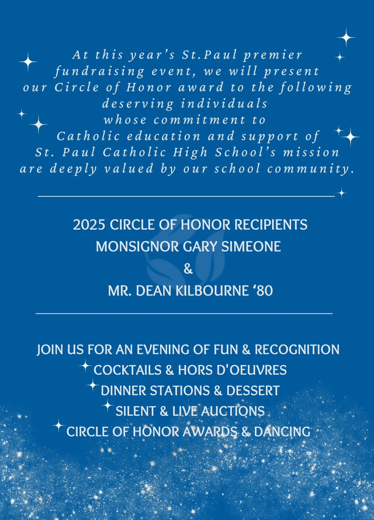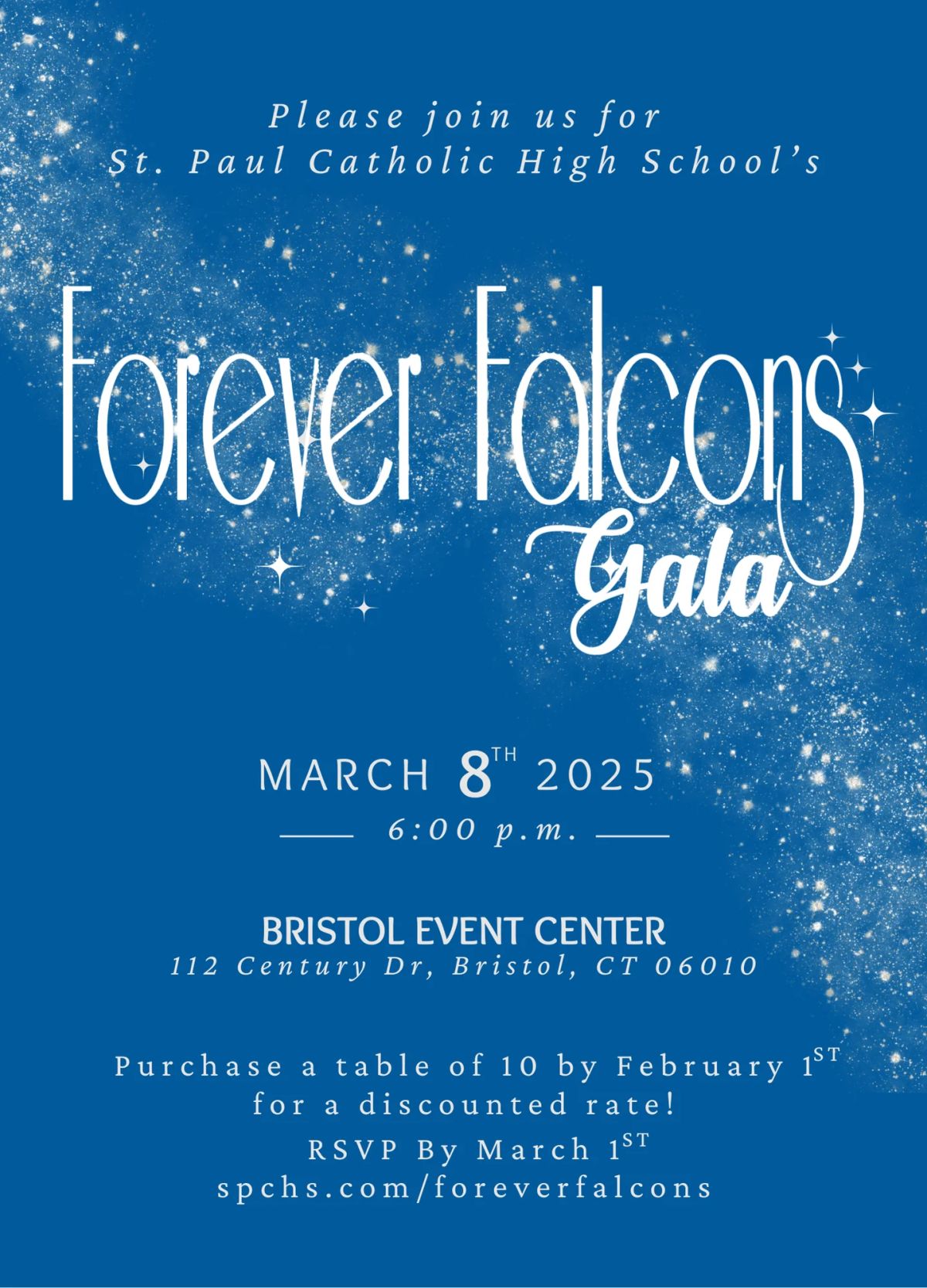 Parent/Student Newsletter - January 2025 |  | As noted in an email last week, on behalf of Mr. Duffany, below is a reminder regarding the opportunity for St. Paul students to complete the Sacraments of Initiation at St. Paul. Archbishop Coyne has allowed St. Paul Catholic High School to offer a program for students in grades 10-12 who have not completed their Sacraments of Initiation. For those who are Catholic, this would include First Eucharist (as needed) and Confirmation. We also welcome those students who wish to become Catholic to join us. We are here to support the parishes we serve and cannot put ourselves in competition with their sacramental programs. | All classes will run on Wednesday afternoons from 2:15 to 3: 30. See schedule for January below. January 8 15 22 -No class: Exam week, early dismissal 29 | Academics & School Counseling | Mid-Term Exam Information Mid-term examinations will take place from January 16-22, 2025 (no school on Monday, January 20). School buses will make regular stops in the morning and depart from school at 12:05 p.m. Students who make a $10 donation in homeroom on Tuesday, January 14th or Wednesday, January 15th to support Catholic Relief Services will be allowed to dress down for exams. The regular school dress code will be in effect for all students choosing not to donate. When students are not scheduled for an exam, they must remain in the Dining Hall for the entire exam period. They may come into school late or leave early if they have only one exam, but only if they have submitted the permission slip below to the Main Office NO LATER than Wednesday, January 15. If a snow day occurs during any one of the exam days, the following school day will be used to cover the delayed exams, thus “bumping” remaining exams up one day. DOWNLOAD PERMISSION SLIP |  | School Counseling BROWN BAG LUNCH SERIES: The School Counseling Department hosts our Brown Bag Lunch career panel series as a great career exploration option for our students. They hear about careers they may be interested in from a panel discussing their job and the path to their career, giving our students an overview of what they do and finish with a Q&A from students. Students, make note of the following dates: January 9th: Health Sciences February 13th: Business, Management, Administration and Finance March 13th: Education April 10th: IT/Computer Science Remember to visit the guidance office and sign up to attend. | SENIORS: Please share with your School Counselor by emailing or visiting them when you have been accepted to a school you've applied to. ALSO, please share your commitments when you have made them so we can celebrate you! Mrs. Coard Mrs. Priemer |  CHECK OUT SPORT NEWS Follow St. Paul Athletics on Social Media Twitter – @stpaulfalcons Instagram – @spchsathletics Most teams have an Instagram account. Make sure to ask coach if you'd like to follow. Check out the calendar of games! SPORT SCHEDULES Can't make it to a game? Watch all St. Paul home games taking place on McPhee Field or in the Rev. Brian Monnerat Gymnasium streaming live on the NFHS Network www.nfhsnetwork.com. |  | Girls' Basketball Championship Banner Reveal! Over Christmas break we celebrated our 2024 Class M State Champions with the unveiling of the State Championship Banner that will proudly hang in the Rev. Brian Monnerat Gymnasium! #statechampions #falcons photo credit: @3cs.photos |   | Our biggest fundraiser of the year brings together the entire St. Paul community – parents, alumni, and friends – for a wonderful evening of fellowship and philanthropy, all in support of our school’s mission: providing a faith-filled, comprehensive education to all of our students. At this year's Gala we will celebrate our Circle of Honor recipients - Monsignor Gary Simeone and Mr. Dean Kilbourne '80. We invite you to join us on Saturday, March 8, 2025 at the new Bristol Event Center to celebrate these honorees, our students and the St. Paul community. TICKETS & SPONSORSHIPS You'll find a list of sponsorships and all the details here. EARLY BIRD SPECIAL Purchase an entire table of 10 for a discounted price of $800.00 by 2/1/25! DONATE AN ITEM Donate and Item to our Live and Silent Auction. NEED AN IDEA? CLICK HERE TO SEE A LIST OF ITEMS WE WOULD LIKE TO ADD TO THE AUCTIONS. Email Alicia Jennings '96 for more information. | Do you know an 8th grade student who is interested in attending St. Paul? There are two opportunities for them to visit! Share the following links with someone that might be interested - and someone from the Admissions Office will be touch. | Be a Falcon for the Day! We'd like to invite them to spend the day with us. Student shadow visits are held on Tuesday’s and Thursday’s with up to eight spaces available each of those days. Visiting students will spend the day with a current student, tour the school, attend classes, have lunch, and meet other students, faculty, and staff. Sign Up For a Shadow Day | Visit our Open House on January 25 There's something greater here. All prospective students and their parents/guardians are invited to join us at our open house where you’ll meet faculty, current students and our St. Paul family. Choose a time that works best for you and your family! RSVP for the OPEN HOUSE | Winter Fest Weekend Join us for the return of Winter Fest Weekend. SAVE THE DATES! Event wristbands will be sold beginning next Monday, 1/13 - $10 for all weekend events. | | Catholic Schools Week Every year our fantastic St. Paul parents come together to provide some yummy food and treats for our school community leaders on Faculty/Staff Appreciation Day during Catholic Schools Week which begins on 1/26/25. The Faculty/Staff Appreciation Luncheon will be held the week before on Tuesday, 1/21/25, during mid-term exams, in order to give the teachers more time to enjoy their meal and each other's company. Also, every year during Catholic Schools Week we treat our teachers to a stocked facul
