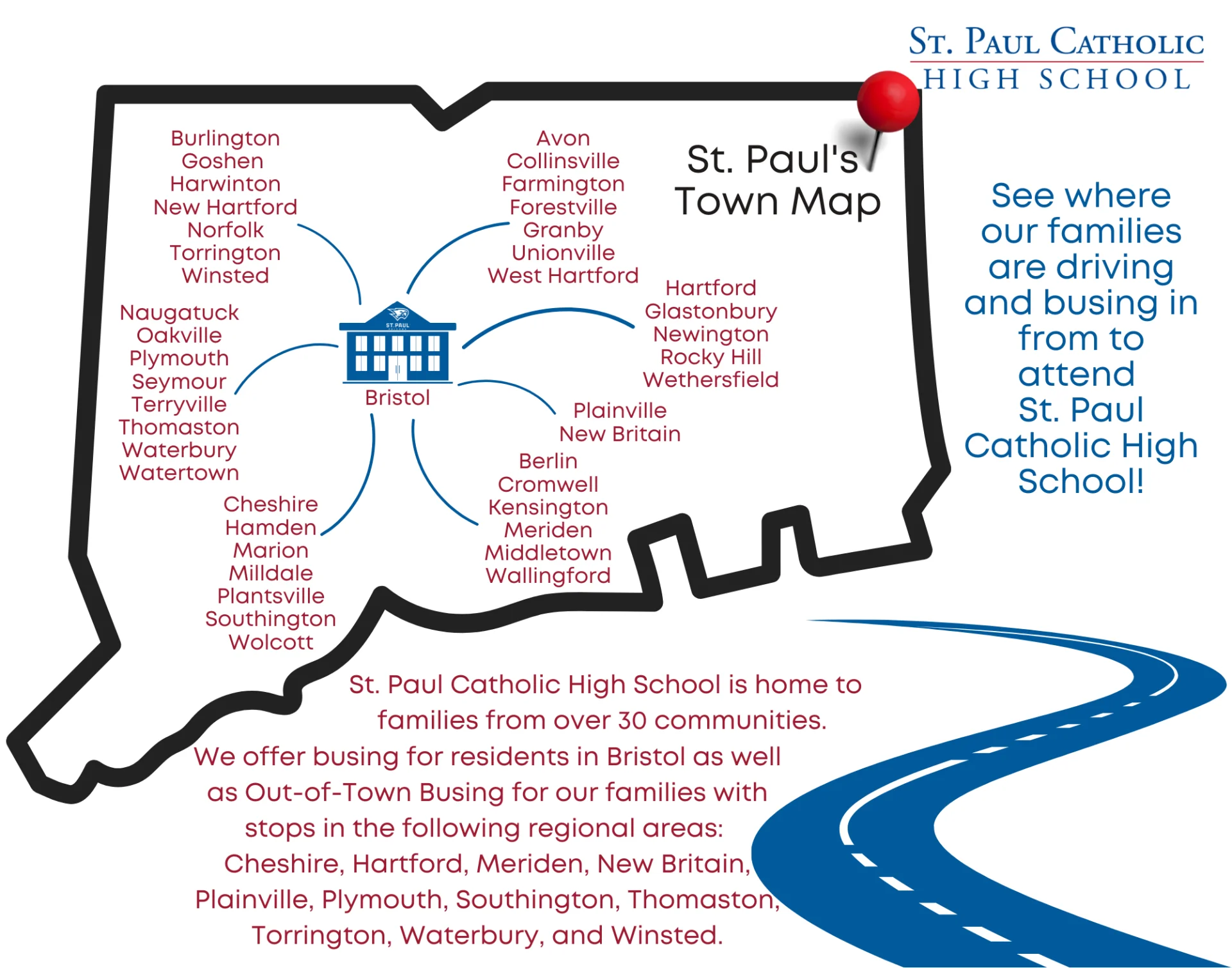 St. Paul Catholic High School's out-of-town busing service is available for students in 30 communities across central Connecticut. Discover convenient transportation options today!