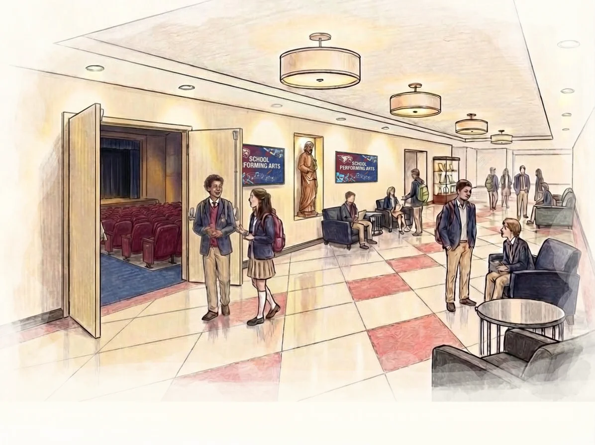 (2) THEATER LOBBY REFRESH For 60 years, our performing arts theater has brought our community together to celebrate talent, creativity, and tradition. Now, it’s time for the space just outside the theater to reflect the same level of excellence found within it. We are seeking support to modernize the lobby and hallway areas just outside the theater by adding comfortable, welcoming furniture and installing mounted TVs to showcase upcoming events, recognize donors, and highlight national awards and achievements. Your generosity will help transform an aging area into a vibrant, functional gathering space — one that reflects the tradition, spirit, and excellence of our entire school community.