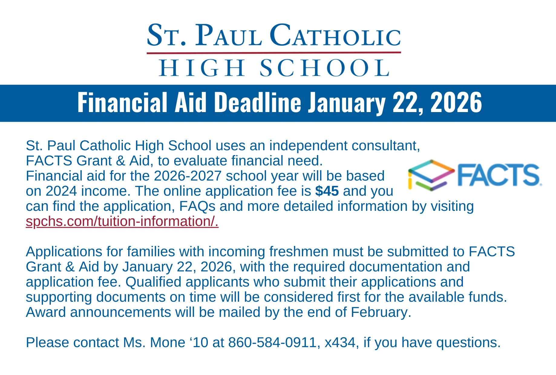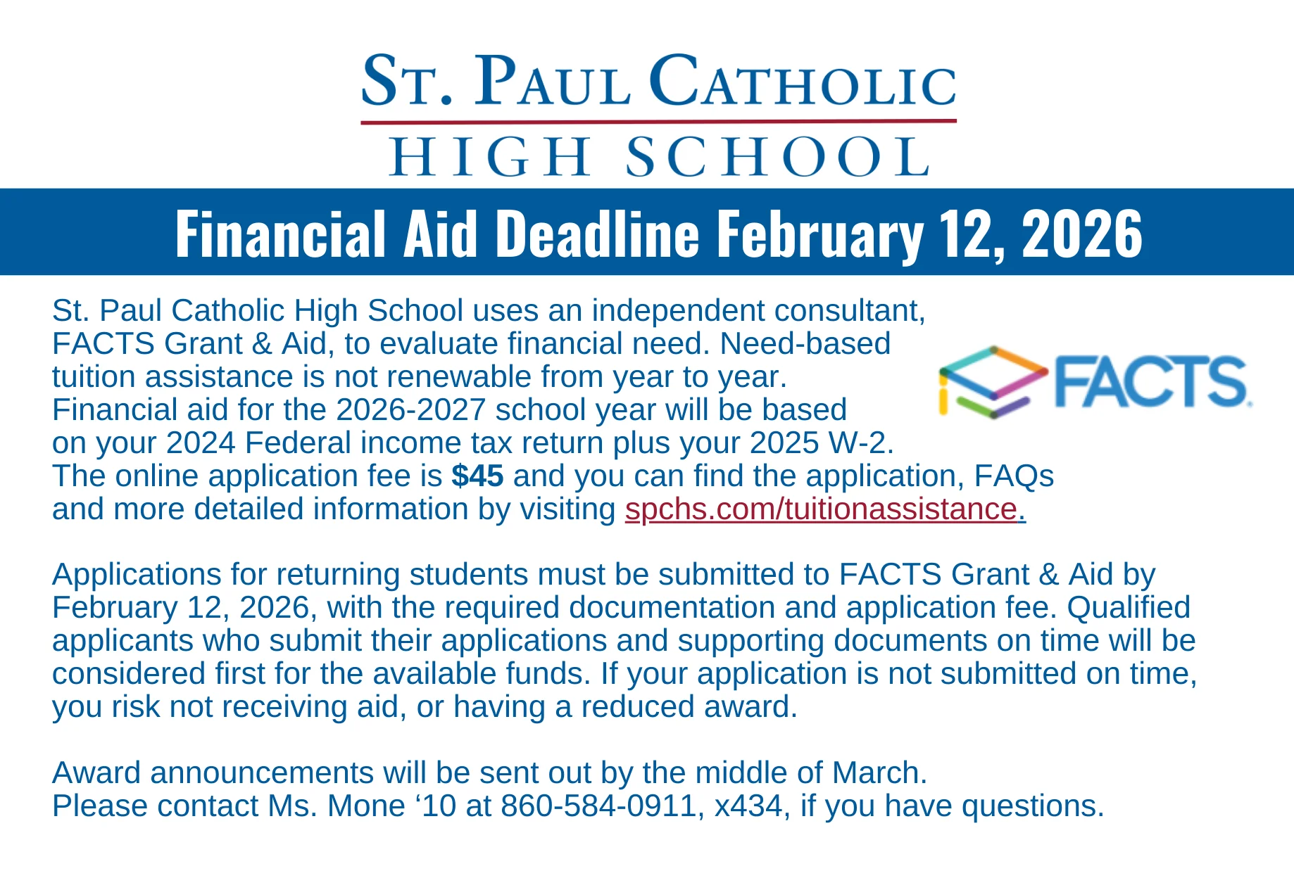 Deadline: Interested candidates should submit their application to St. Paul Catholic High School by February 2, 2026. In addition, a tuition assistance application should be submitted to FACTS Grant & Aid. A link to the FACTS Grant & Aid online application is available at https://online.factsmgt.com/grant-aid/inst/3JF61/landing-page. FACTS Grant & Aid is an independent consultant used by St. Paul Catholic High School to evaluate financial need.