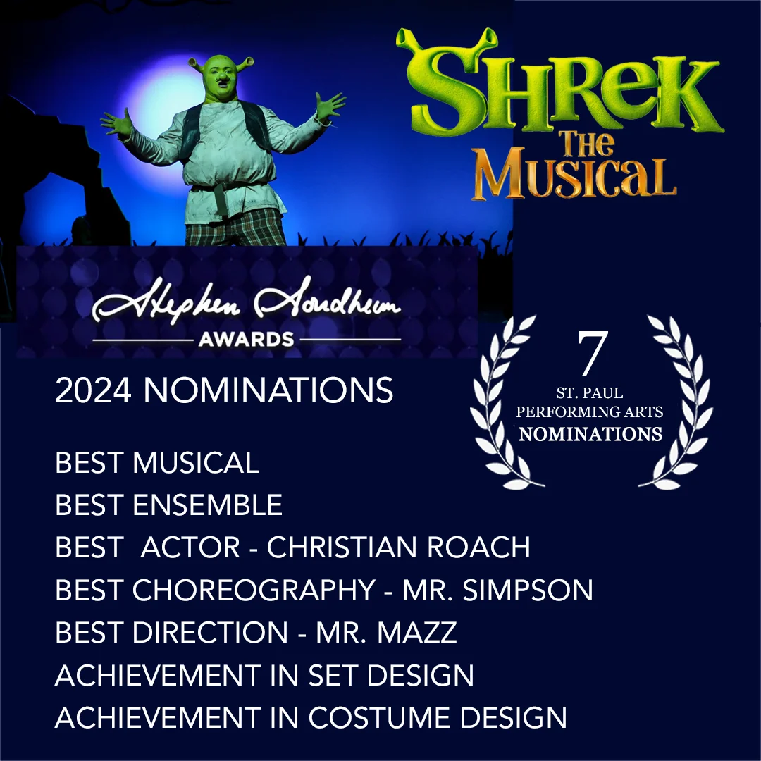 Congratulations to St. Paul Performing Arts' cast and crew for earning 7 BIG nominations from the Sondheim Awards. The Stephen Sondheim Awards Gala is at the Shubert Theatre in New Haven on May 18, 2024, celebrating all the hard work by high school's around the state as well as in Massachusetts. We are excited for the Gala, where our cast will be performing and showcasing our students' work from this year's production of SHREK!