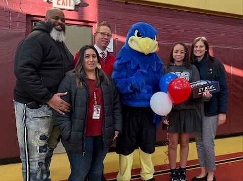 We were so excited to visit St. Paul Kensington school today and present Kaitlyn P., in front of the school, with the first female acceptance to St. Paul Catholic High School’s class of 2030. The Falcon then wished all students a good day with high fives as they returned to class. Kaitlyn, we can’t wait to see you in the hallways next year! Go Falcons!
