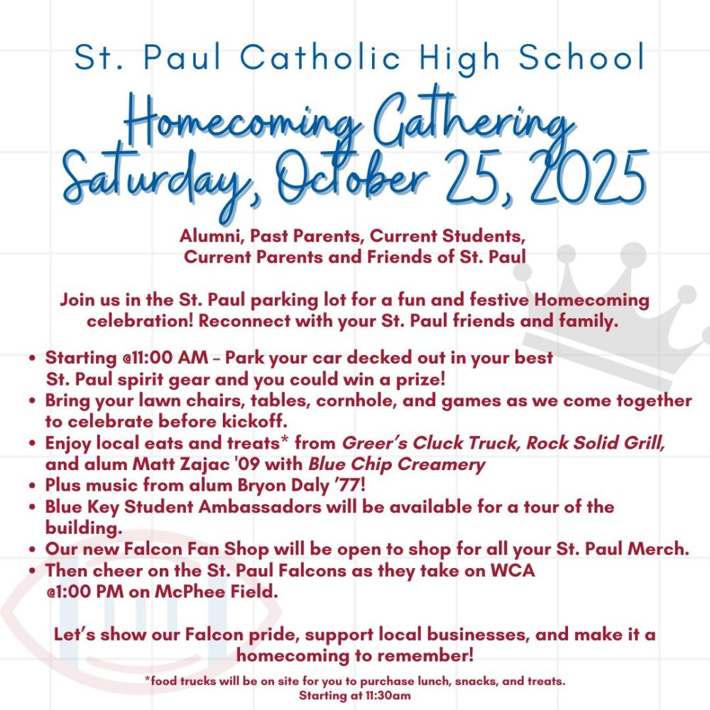 You're invited to our Homecoming Gathering – next Saturday, October 25! See the details below! We hope to see many of you there so we can catch up! @spchs2010 @spchs_class_of_2024 @spchs_class_of_2025 @rocksolidgrill @greers_cluck_truck