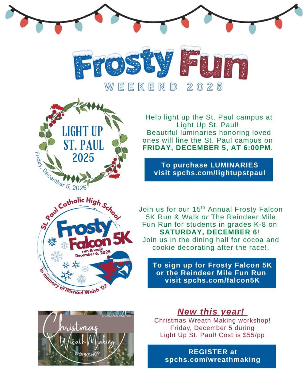THE NEXT MORNING - Our Frosty Falcon 5K (run or walk). This is our 15th annual 5K in memory of Michael Walsh '07. Dress in your favorite Christmas outfit and come have a blast - medals, cocoa and snacks after the race.