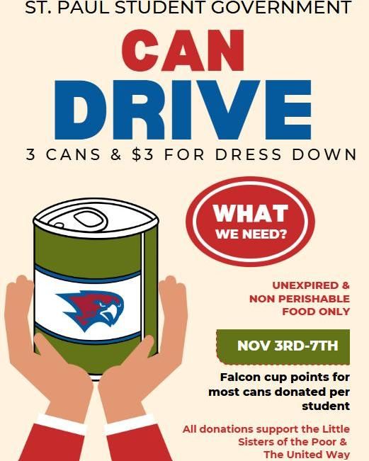Our Can Drive starts tomorrow. If students bring in 3 CANS AND $3 they may dress down on Friday, November 7th.