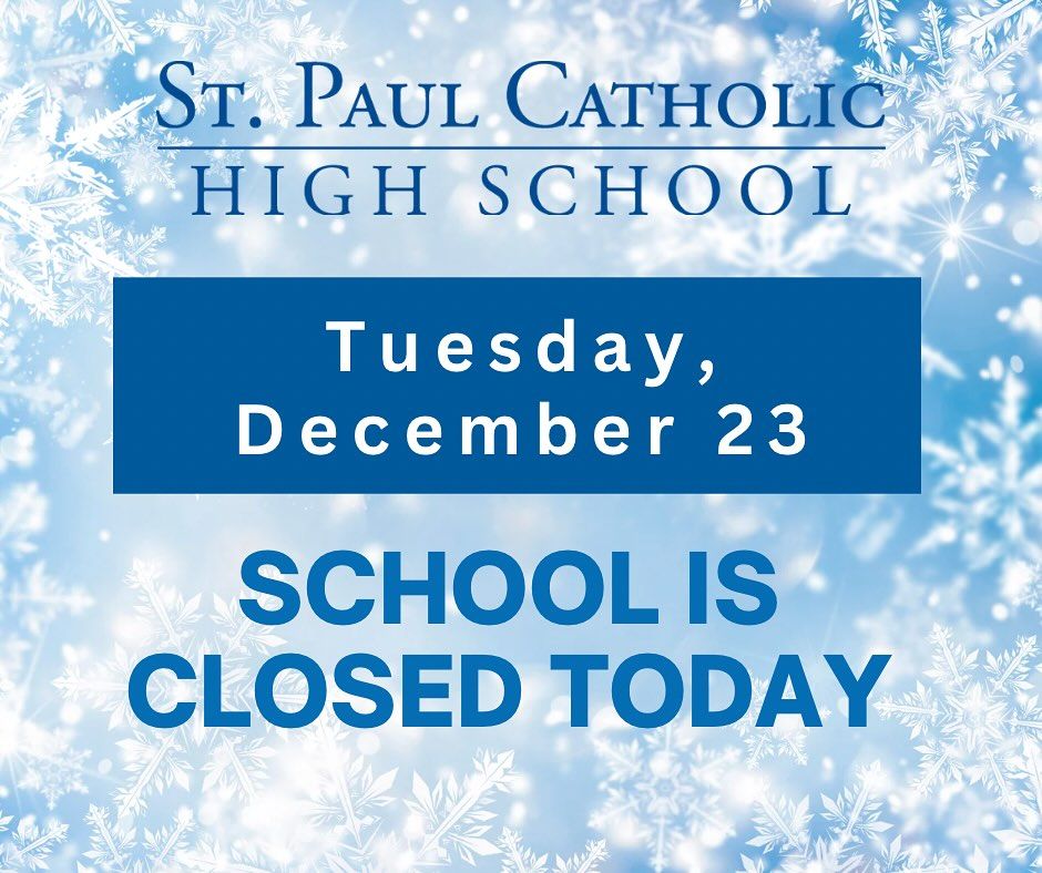 Due to the predicted, inclement weather, St. Paul Catholic High School will be closed today, Tuesday, December 23rd. Stay safe and Merry Christmas and Happy New Year.